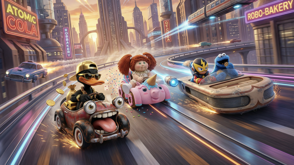 Die Idee zu MANIAC RACE war einfach: ein fiktives Videospiel erschaffen, das sich anfühlt, als hätte es Ende der 90er existieren können — irgendwo zwischen Saturday-Morning-Cartoons und der Müslischale — in einer Welt, in der Werbung noch laut und schrill war und KPI aus Einschaltquoten und Ladenverkäufen bestanden.